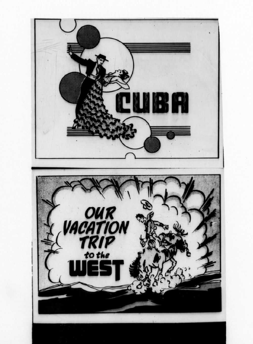 Nous voyons un couple de danseurs illustrant une publicité de Cuba et un cow-boy sur son cheval illustrant une publicité de l'ouest