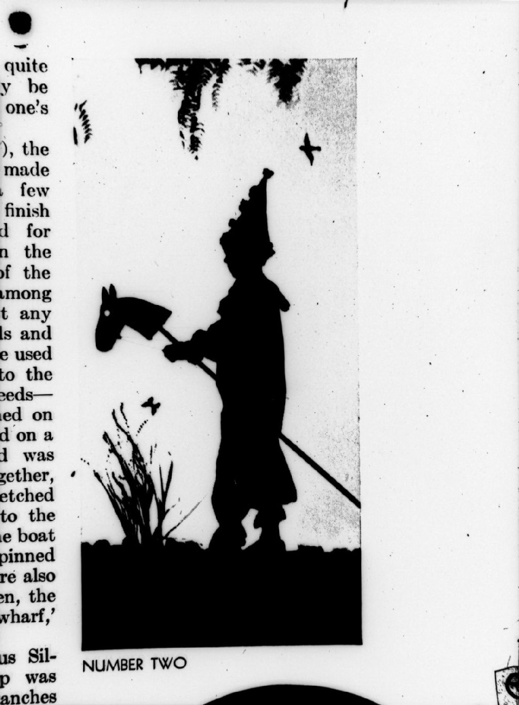 Nous voyons la silhouette d'un enfant habillé en pierrot jouant au cavalier avec un bâton ayant une tête de cheval à une extrémité