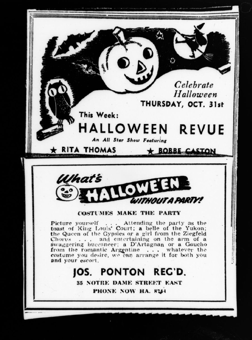 Nous voyons une affiche publicitaire annonçant une revue musicale à l'occasion de l'halloween et une autre affiche publicitaire d'un magasin de costumes