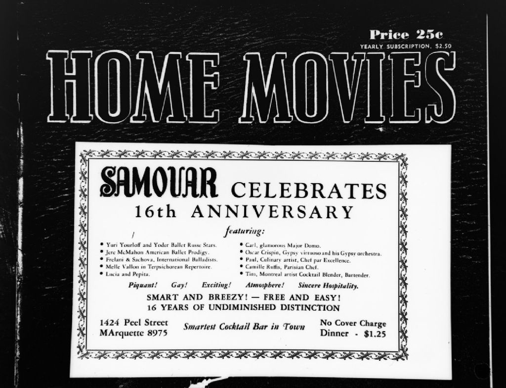 Nous voyons une affiche publicitaire du «Samovar Restaurant & Cabaret» de la rue Peel à Montréal et le titre «Home Movies»