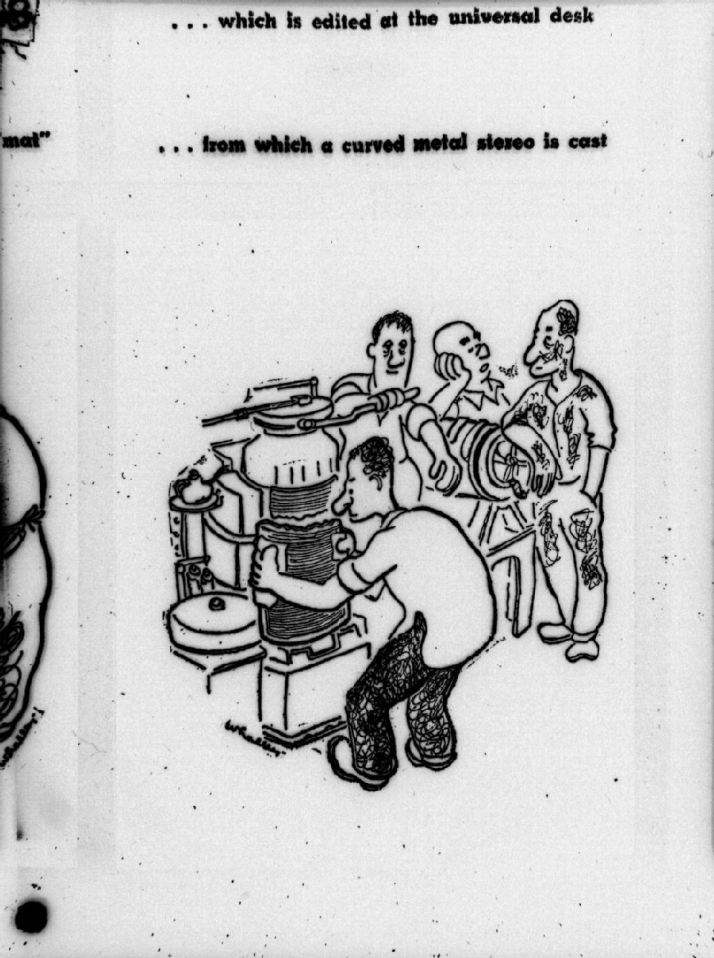 Nous voyons un dessin représentant des employés imprimant le journal sur une matrice cylindrique