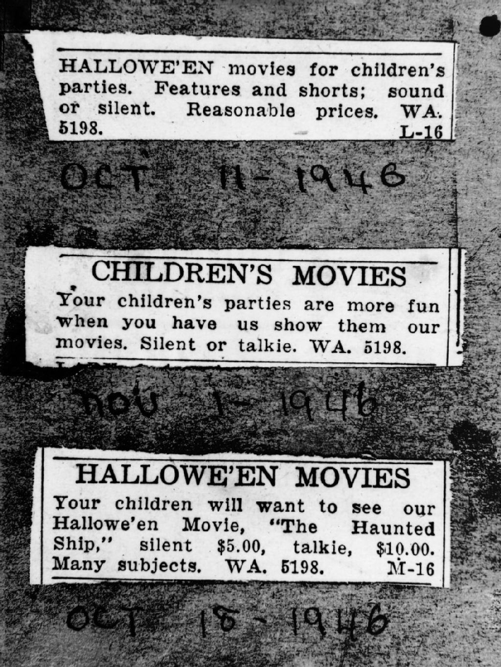 Nous voyons trois petites annonces publiées dans les journaux offrant des projections privées de films pour enfants et de films pour l'halloween