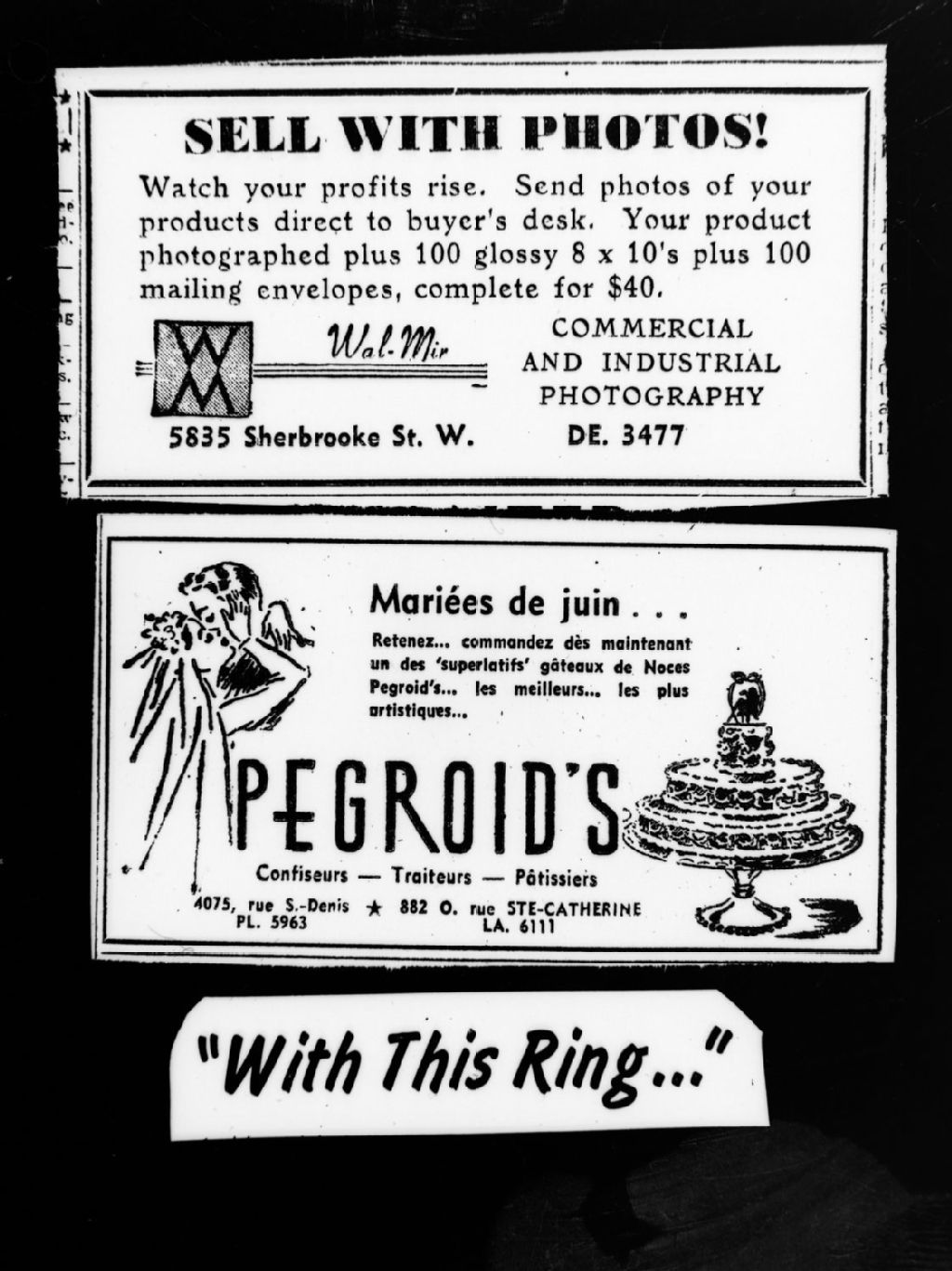 Nous voyons une annonce publicitaire du photographe commercial Wal-Mir et celle du pâtissier-traiteur Pegroid's ainsi qu'un titre