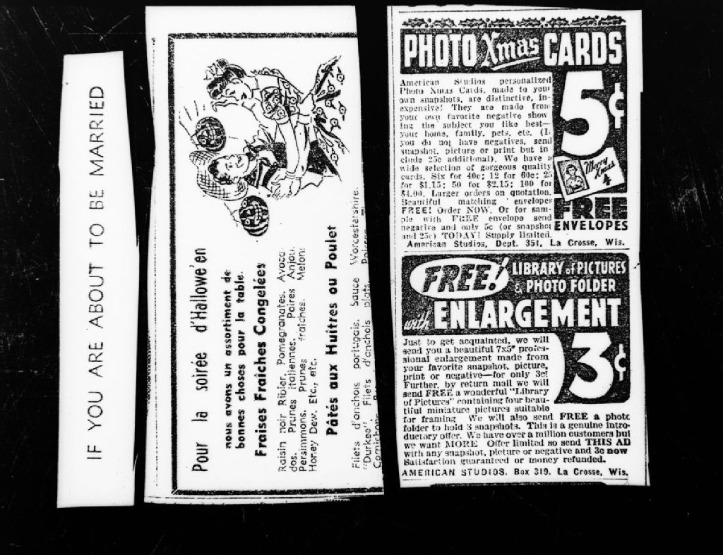 Nous voyons une annonce publicitaire pour une soirée d'halloween, une annonce publicitaire pour des photos personnalisées de cartes de Noël et un titre
