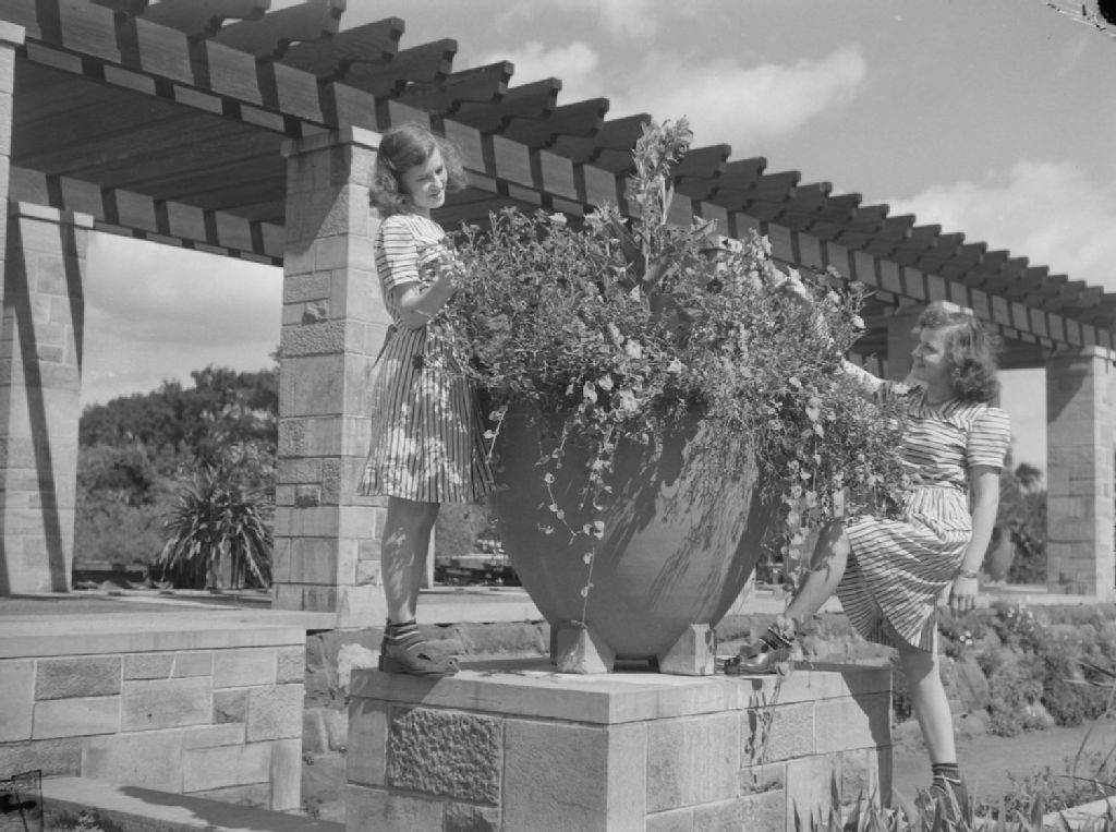 Feature. Helene & Jacqueline St. Jean at Botanical Garden, 11 août 1946, Archives nationales à Montréal, Fonds Conrad Poirier, (06M,P48,S1,P13364), Poirier, Conrad.