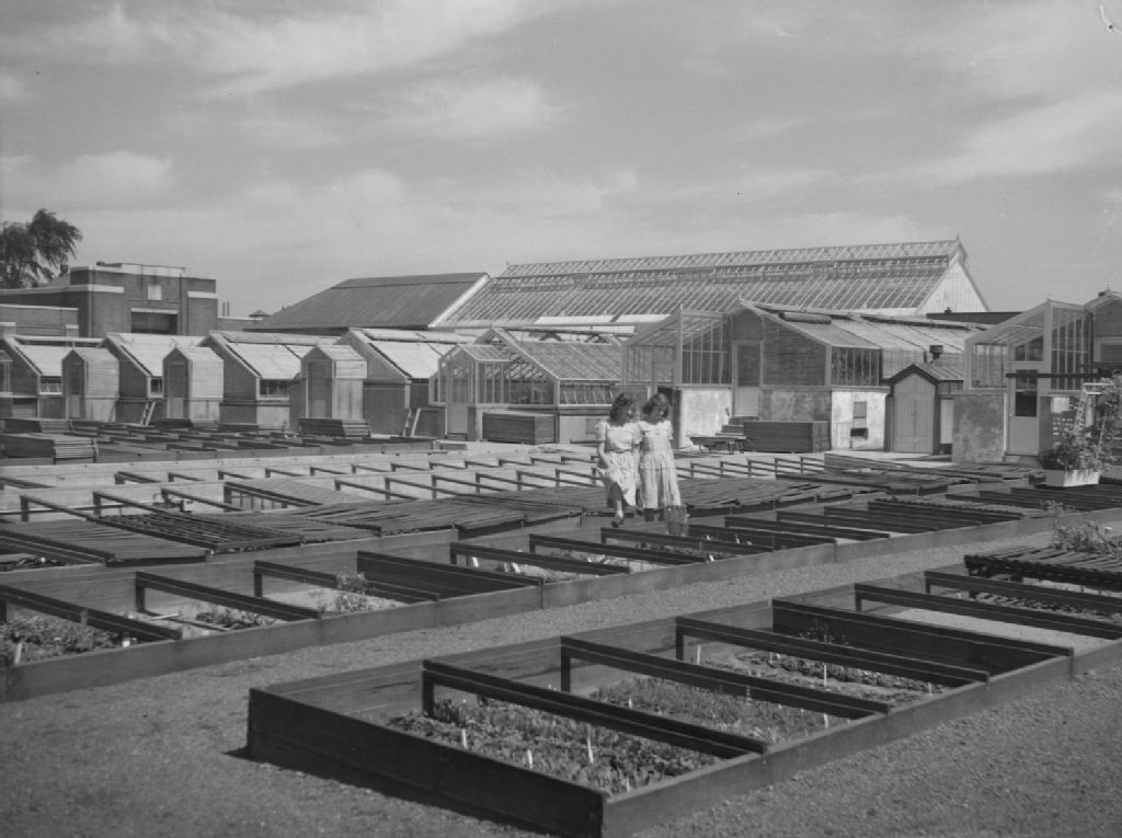 Les jumelles Hélène et Jacqueline Saint-Jean déambulent au milieu de jardins communautaires ou de semis de plantes ensemencés dans des rangées de châssis de bois rectangulaires. À l'arrière-plan, nous voyons les serres du Jardin botanique de Montréal