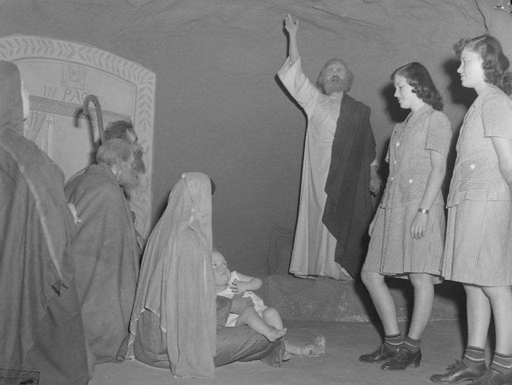 Les jumelles Hélène et Jacqueline Saint-Jean visitent le Musée historique canadien, musée de statues de cire situé sur le chemin Queen-Mary à Montréal. Elles regardent une scène représentant les premiers chrétiens à l'écoute d'un prophète