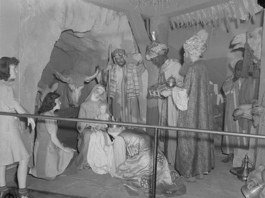 Les jumelles Hélène et Jacqueline Saint-Jean visitent le Musée historique canadien, musée de statues de cire situé sur le chemin Queen-Mary à Montréal. Elles regardent une scène représentant les Rois mages rendant hommage à l'enfant Jésus assis sur les genoux de la Vierge Marie