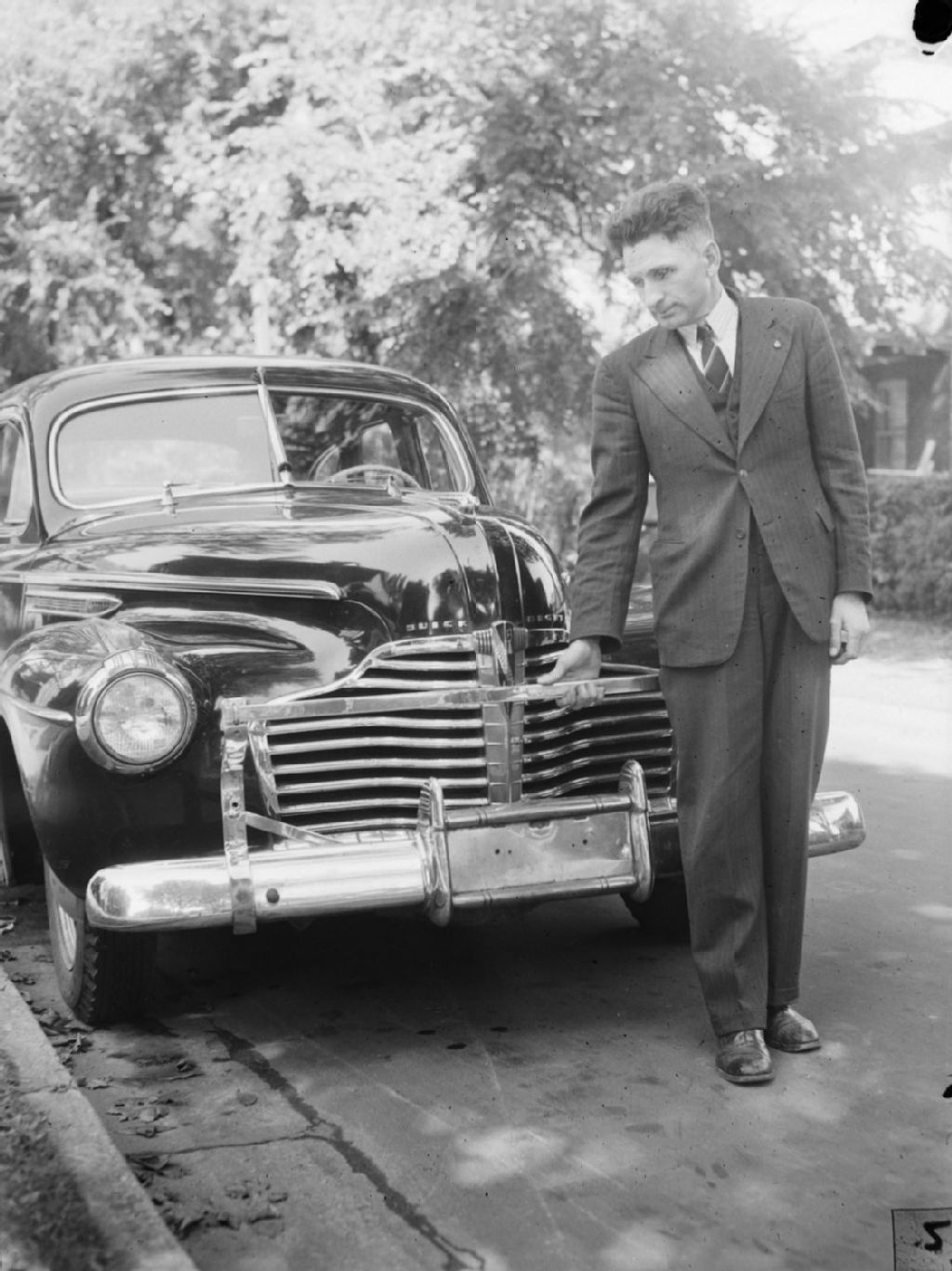 Monsieur L'Espérance a la main sur un cadre de métal attaché au pare-chocs placé à l'avant d'une Buick Eight. Il a fait breveter l'invention de ce nouveau type de pare-chocs
