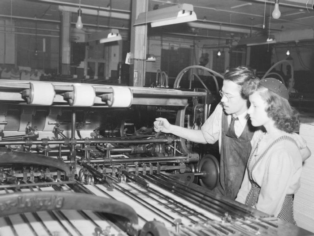 Les jumelles Jacqueline et Hélène Saint-Jean visitent les locaux du journal Le Samedi situés rue de Bullion à Montréal. Un employé leur explique le fonctionnement des presses