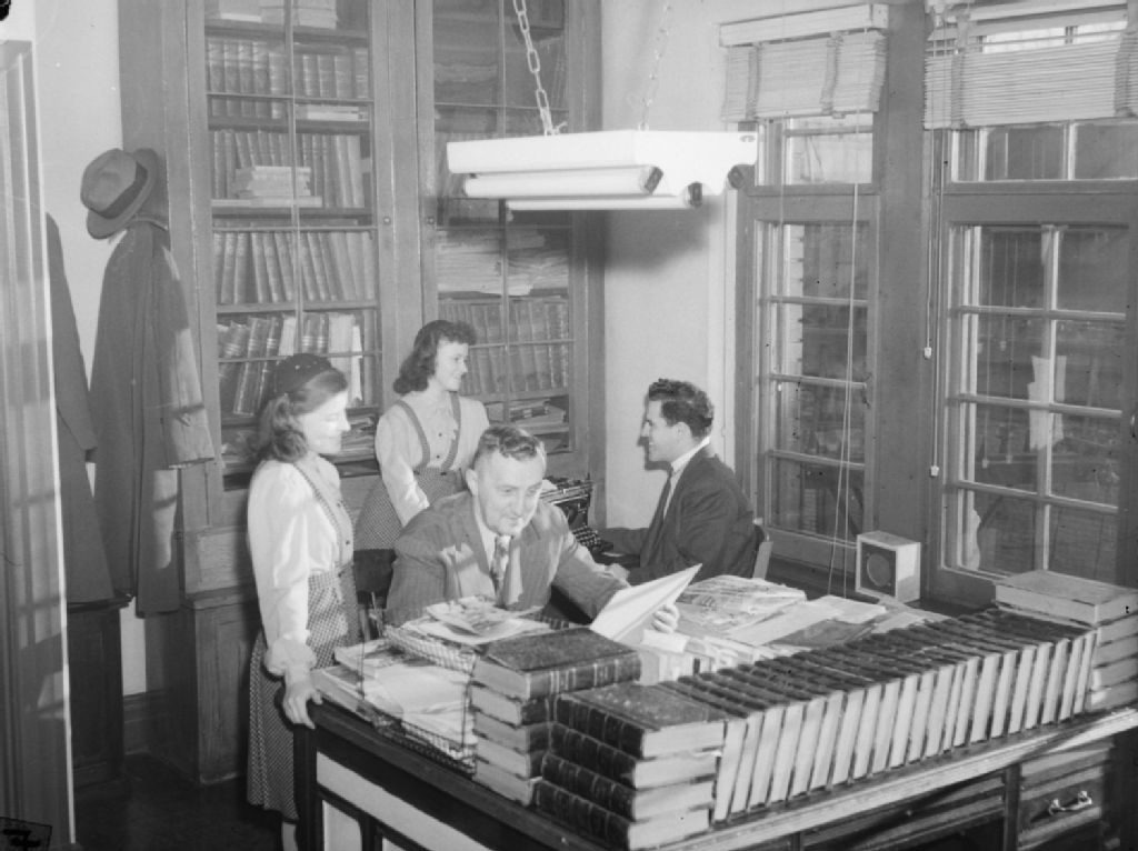 Les jumelles Jacqueline et Hélène Saint-Jean visitent les locaux du journal Le Samedi situés rue de Bullion à Montréal. Nous les voyons discutant avec des journalistes dans une bibliothèque