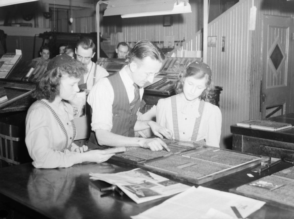 Les jumelles Jacqueline et Hélène Saint-Jean visitent les locaux du journal Le Samedi situés rue de Bullion à Montréal. Elles se tiennent de chaque côté du typographe qui fait la mise en page
