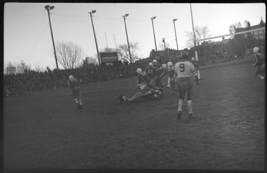 Au stade Percival Molson de l'Université de McGill à Montréal, lors d'un match de football opposant les équipes «Montreal Indians» et «Toronto Argos», nous voyons des joueurs sur le terrain