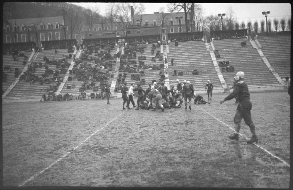 Match de football entre les «McGill Redmen» et «Queens» au stade Percival Molson de l'Université McGill à Montréal. Nous voyons des joueurs sur le terrain et des spectateurs dans les gradins. En arrière-plan, nous apercevons des pavillons de l'université