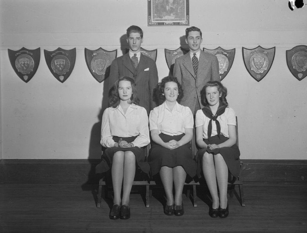 Nous voyons trois jeunes filles et deux jeunes hommes étudiant à The High School of Montreal. À l'arrière-plan, nous remarquons des plaques remportées aux compétitions intercollégiales d'athlétisme de l'Université McGill