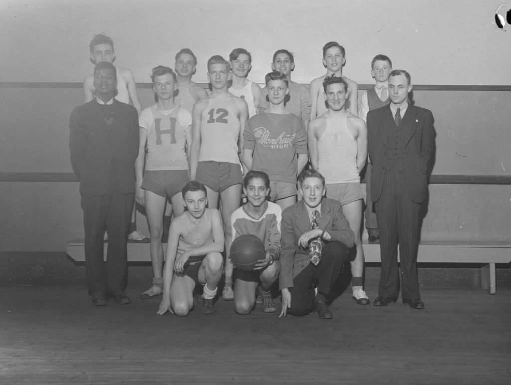Nous voyons l'entraîneur et les joueurs de l'équipe de basket-ball de The High School of Montreal