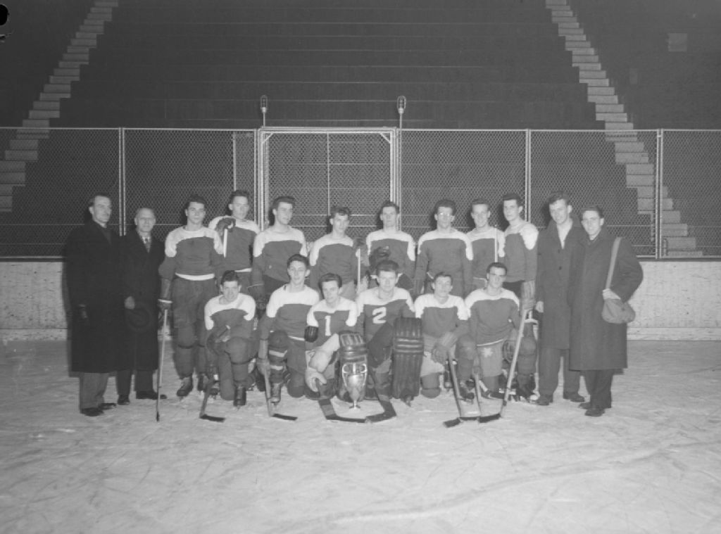 Nous voyons les entraîneurs et les joueurs d'une équipe de hockey de The High School of Montreal sur la glace d'une patinoire intérieure. Ils présentent un trophée qu'ils ont remporté