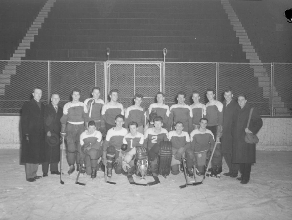 Nous voyons les entraîneurs et les joueurs d'une équipe de hockey de The High School of Montreal sur la glace d'une patinoire intérieure. Ils présentent un trophée qu'ils ont remporté