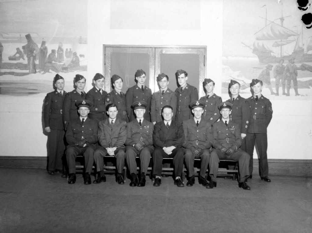 Nous voyons un groupe de cadets en uniforme entourant un enseignant de The High School of Montreal. À l'arrière-plan, nous remarquons des fresques illustrant la découverte du Canada