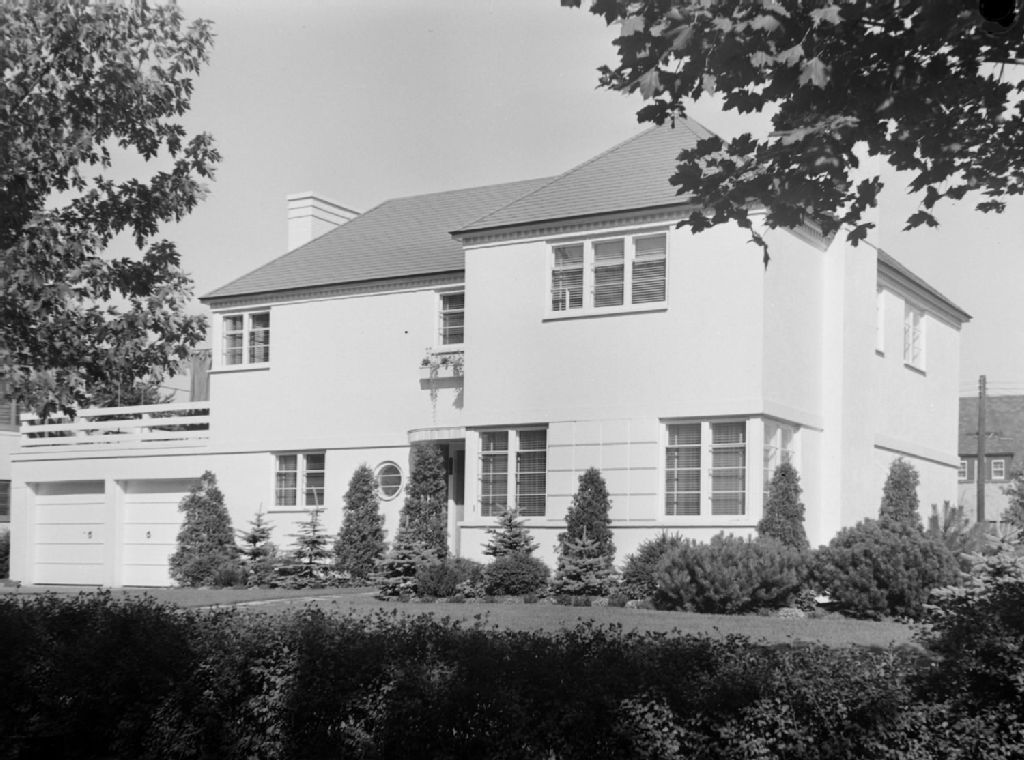 Nous voyons le jardin d'arbres d'ornement, d'arbustes et de fleurs devant la maison de Georges Poirier située au 350, avenue Stanstead à ville Mont-Royal