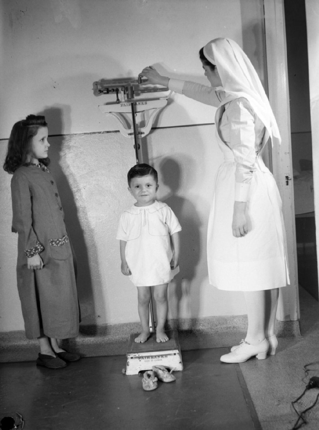 Une infirmière de l'hôpital Sainte-Justine à Montréal prend le poids d'un petit garçon sur un pèse-personne à poids de marque Fairbanks. Une petite fille attend son tour