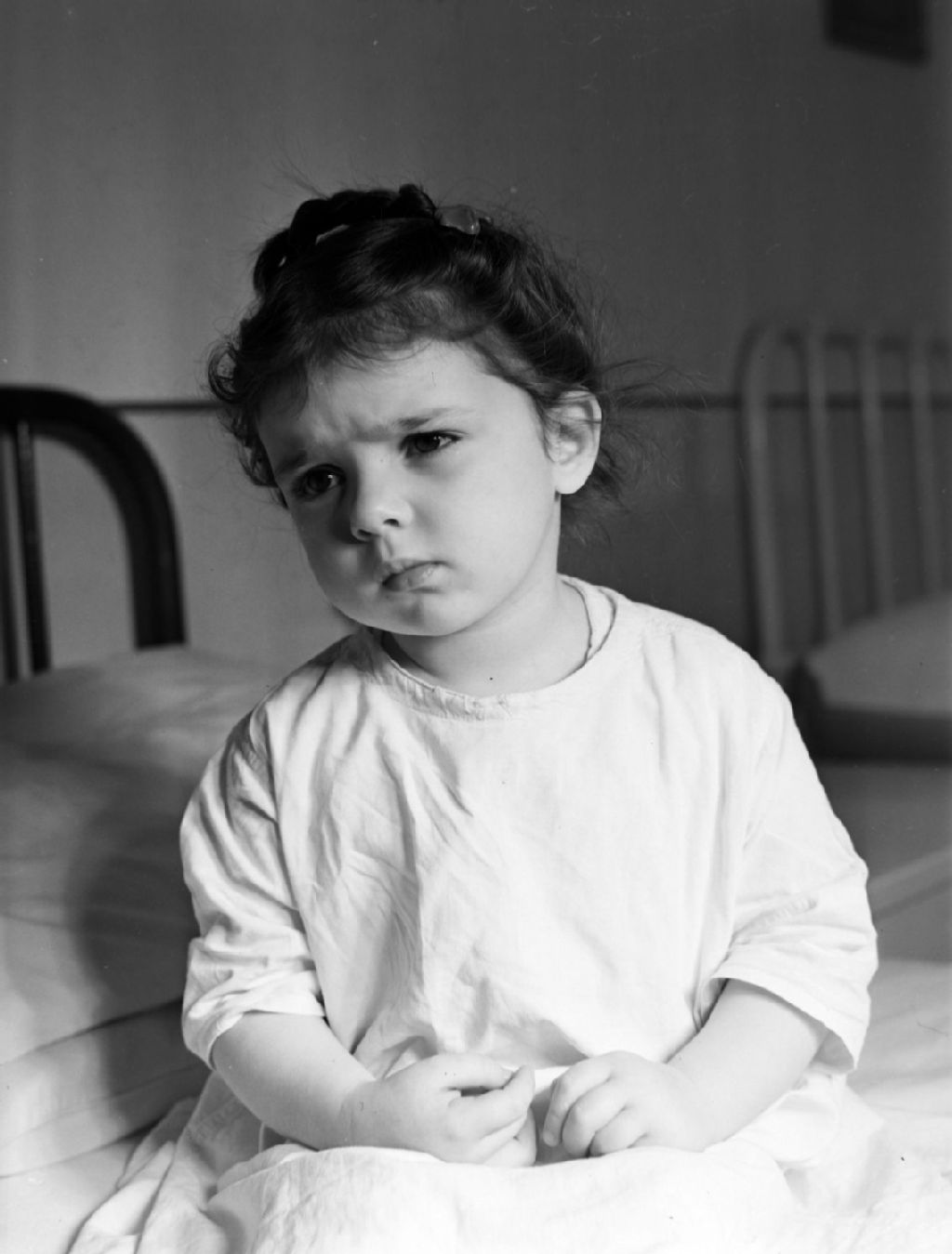 Nous voyons une enfant assis sur un lit dans un dortoir de l'hôpital Sainte-Justine à Montréal