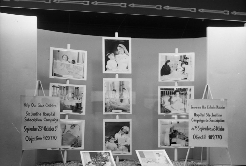 Les photographies de Conrad Poirier illustrent un kiosque consacré à la campagne de souscription de l'hôpital Sainte-Justine à Montréal