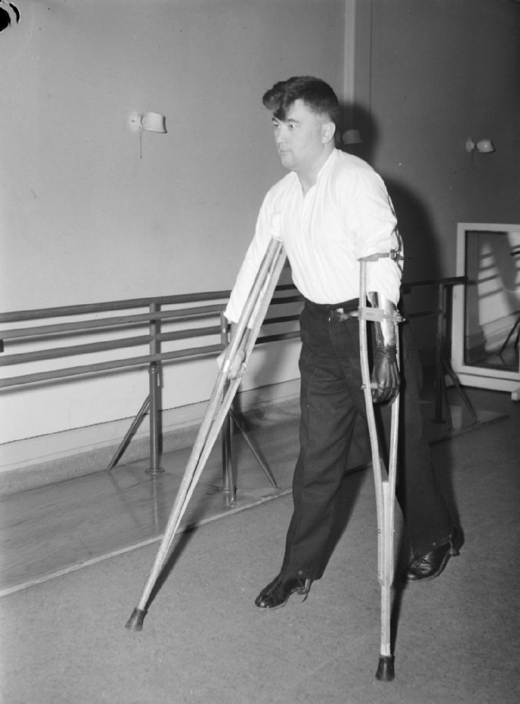 Nous voyons un homme se déplaçant sur des béquilles lors d'un traitement de physiothéraphie à l'hôpital Sainte-Anne pour anciens combattants à Sainte-Anne-de-Bellevue
