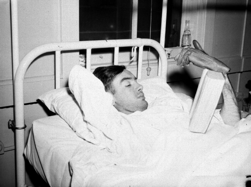 Un patient, couché sur le dos, lit un livre à l'hôpital Sainte-Anne pour anciens combattants à Sainte-Anne-de-Bellevue. Un gant recouvre la main qui tient une bouteille de boisson gazeuse