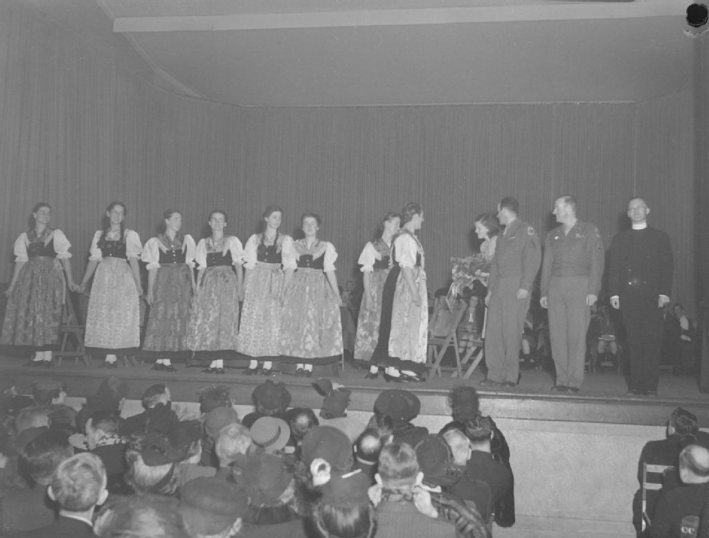 Nous voyons la famille Von Trapp et Mgr Franz Wasner sur la scène. Une jeune femme remet des fleurs à Maria Von Trapp