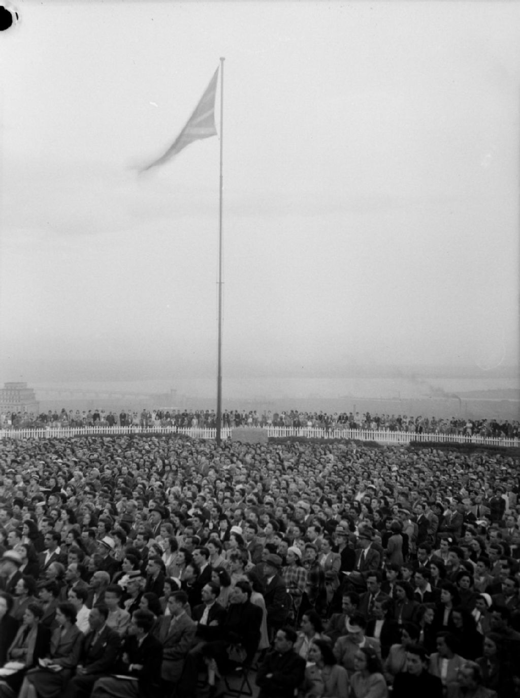 Nous voyons la foule qui assiste à un concert d'un orchestre symphonique présenté devant le chalet du mont Royal. L'édifice de la brasserie Black Horse se profile à l'arrière-plan