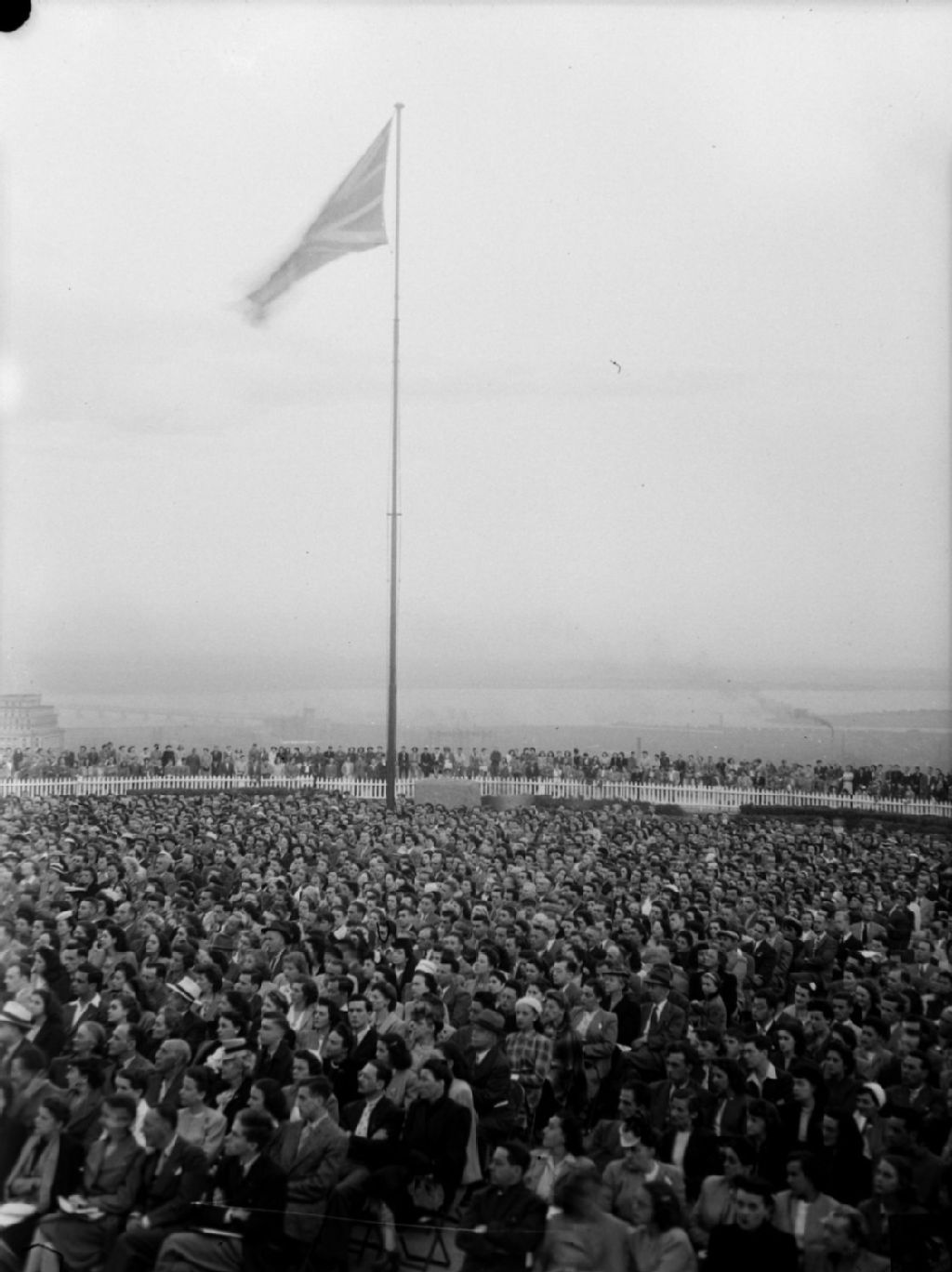 Nous voyons la foule qui assiste à un concert d'un orchestre symphonique présenté devant le chalet du mont Royal. L'édifice de la brasserie Black Horse se profile à l'arrière-plan