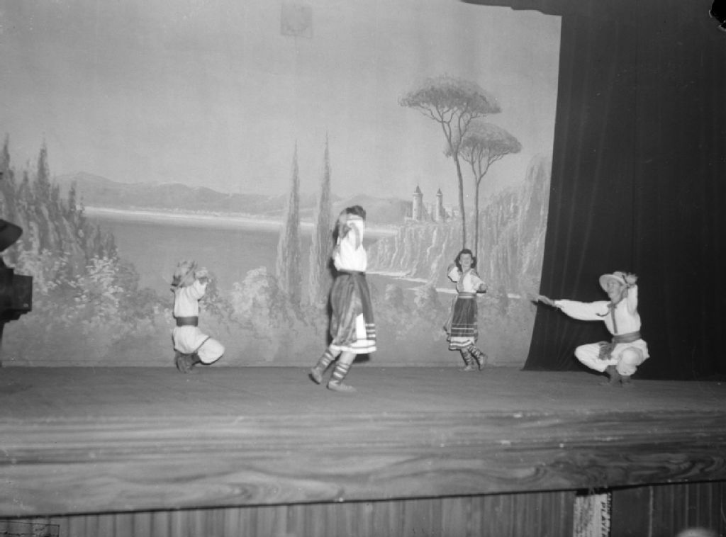 Nous voyons deux couples de danseurs ukrainiens qui participent à un concert ukrainien présenté sur la scène de «His Majesty's Theatre» de la rue Guy à Montréal. Les danseurs exécutent la danse russe alors que les danseuses tournent autour d'eux