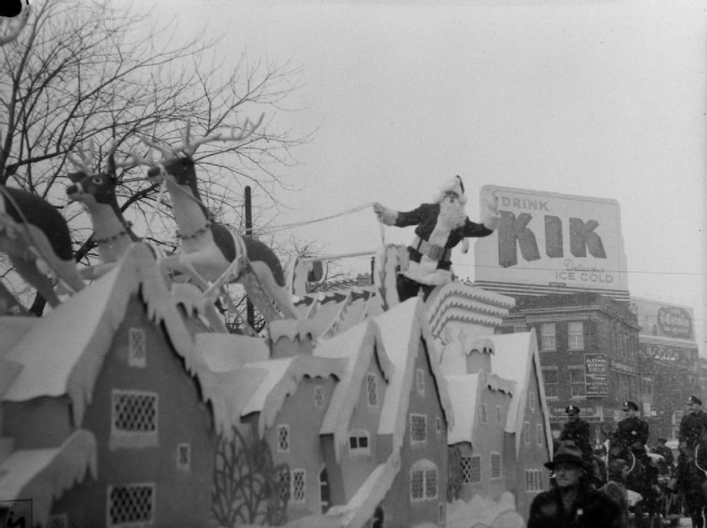 Le Père Noël salue de la main du haut de son char allégorique, suivi de policiers à cheval, qui passe sur l'avenue du Parc à Montréal. À l'arrière-plan, nous voyons un panneau de la boisson gazeuse Kik et «The Alexander Business College» situé à l'intersection des avenues du Mont-Royal Ouest et du Parc