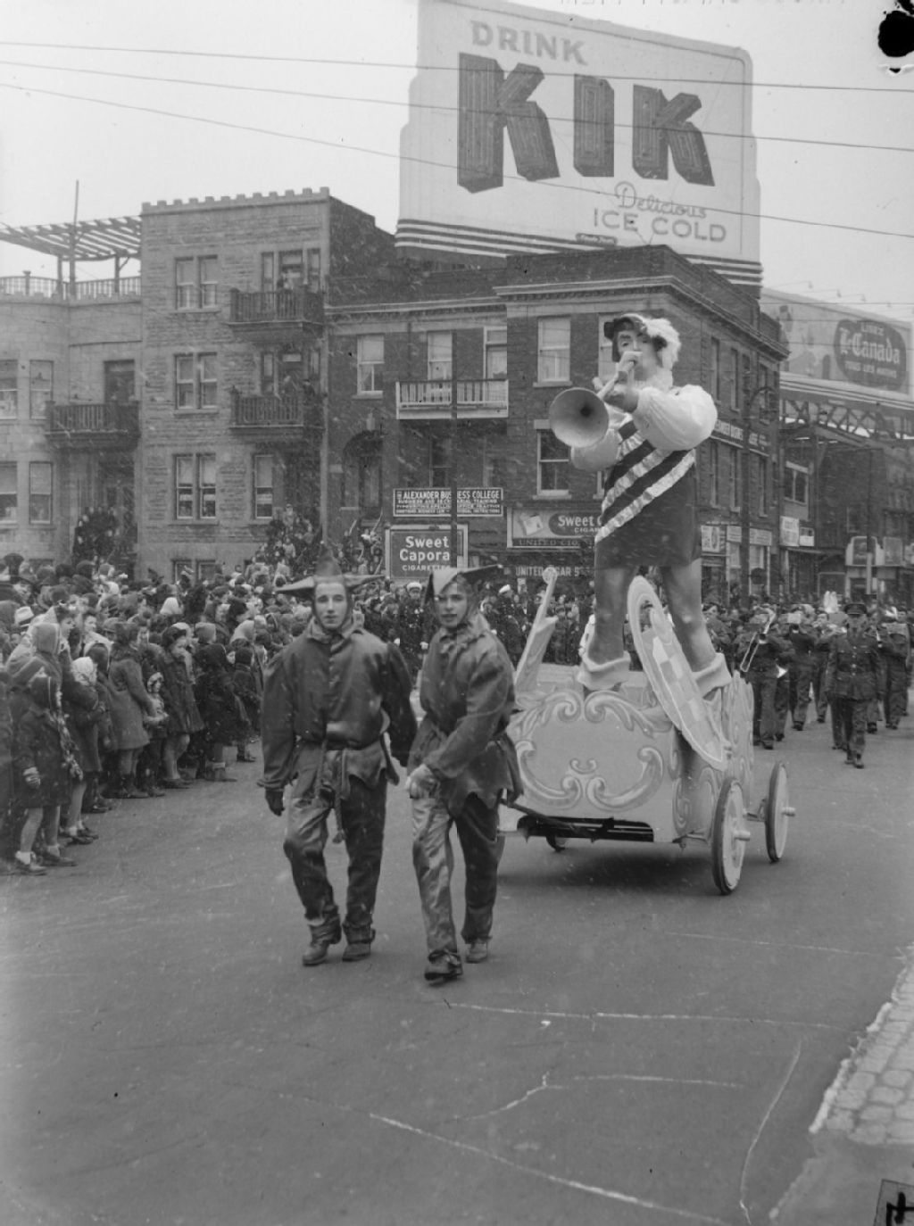 Le défilé du Père Noël passe sur l'avenue du Parc à Montréal. À l'arrière-plan, nous voyons un panneau de la boisson gazeuse Kik et «The Alexander Business College» situé à l'intersection des avenues du Mont-Royal Ouest et du Parc