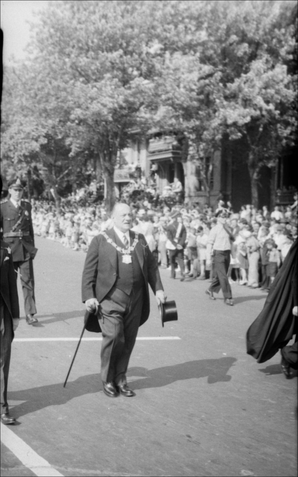 Le maire de Montréal, Camillien Houde, en queue de pie, collier du maire au cou et tenant un chapeau haut de forme, prend part au défilé de la Saint-Jean-Baptiste