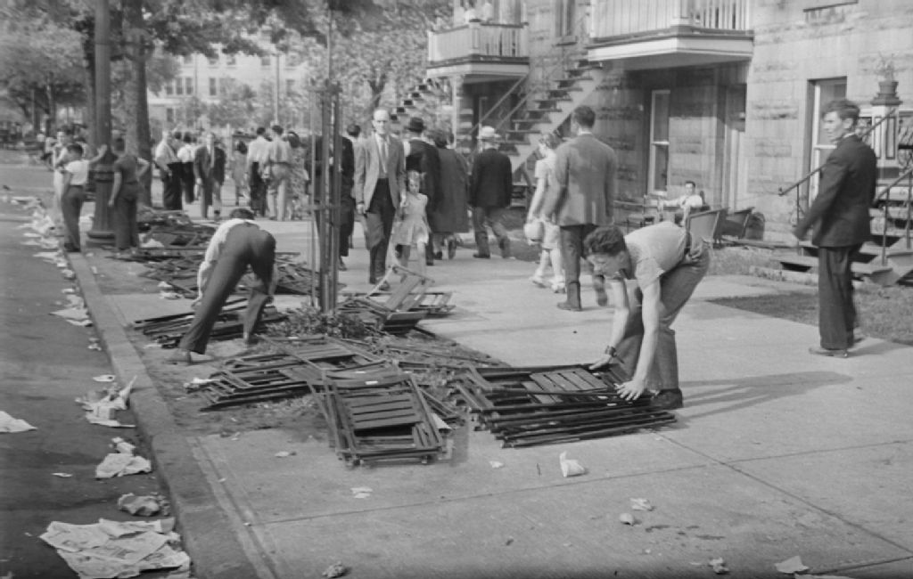 Deux ouvriers empilent des chaises pliantes sur le trottoir après le passage du défilé de la Saint-Jean-Baptiste à Montréal