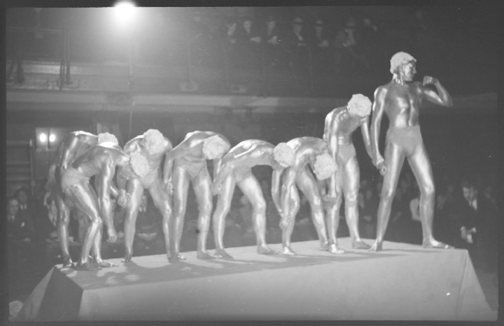 Dans un gymnase, sur une estrade, un groupe d'hommes en maillot fait une démonstration de musculation. Nous remarquons, derrière les athlètes, des spectateurs