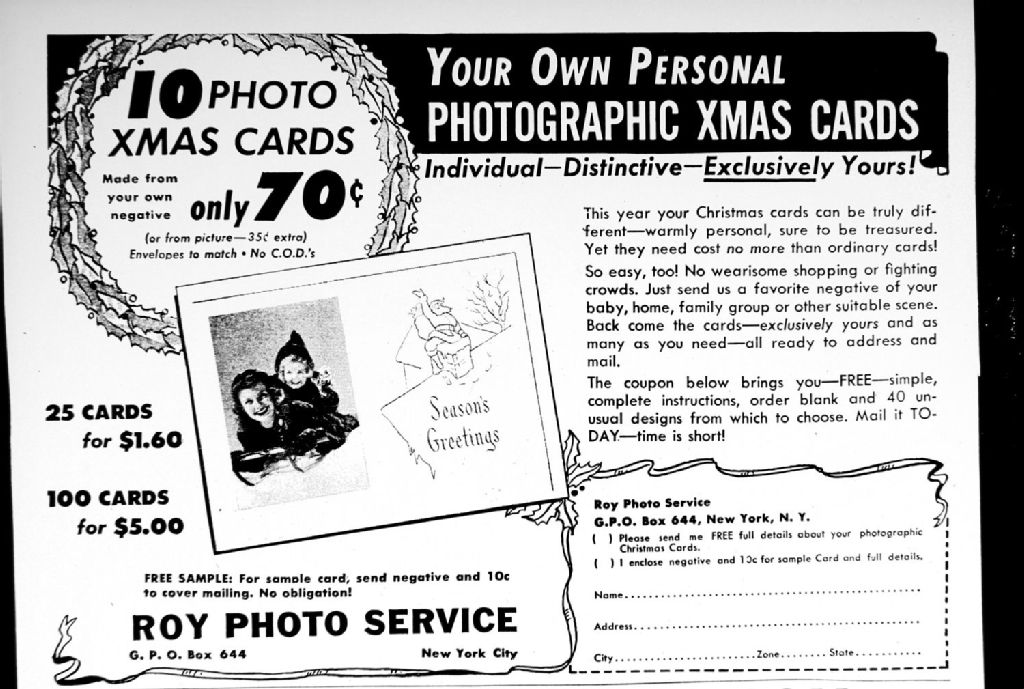 Nous voyons une publicité illustrée de Roy Photo Service pour les cartes de Noël personnalisées par des photographies