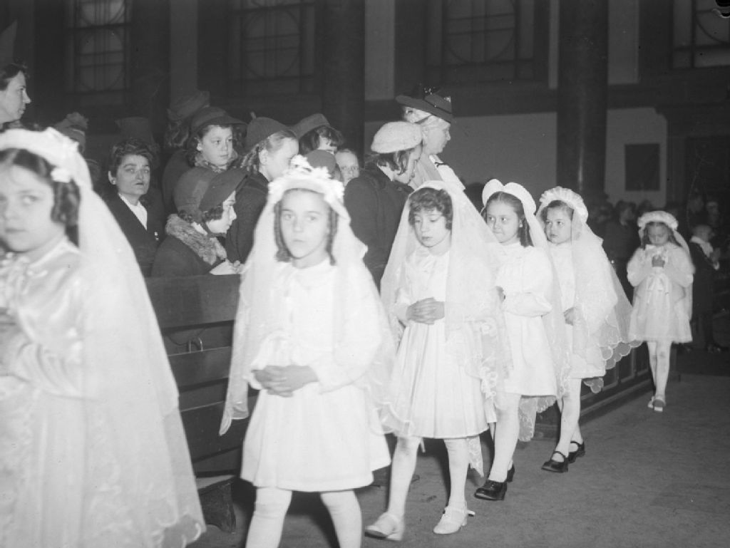 Des premières communiantes, coiffées de leur voile, retournent à leur banc après avoir reçu l'eucharistie. Elles sont à l'église Sainte-Marguerite-Marie située rue Dorion à Montréal