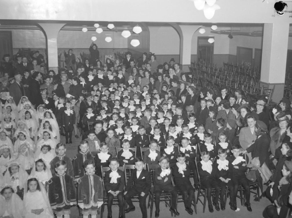 Religious. First Communion : Eglise Ste. Marguerite Marie : Abbe Bastien, 9 avril 1946, Archives nationales à Montréal, Fonds Conrad Poirier, (06M,P48,S1,P14069), Poirier, Conrad.