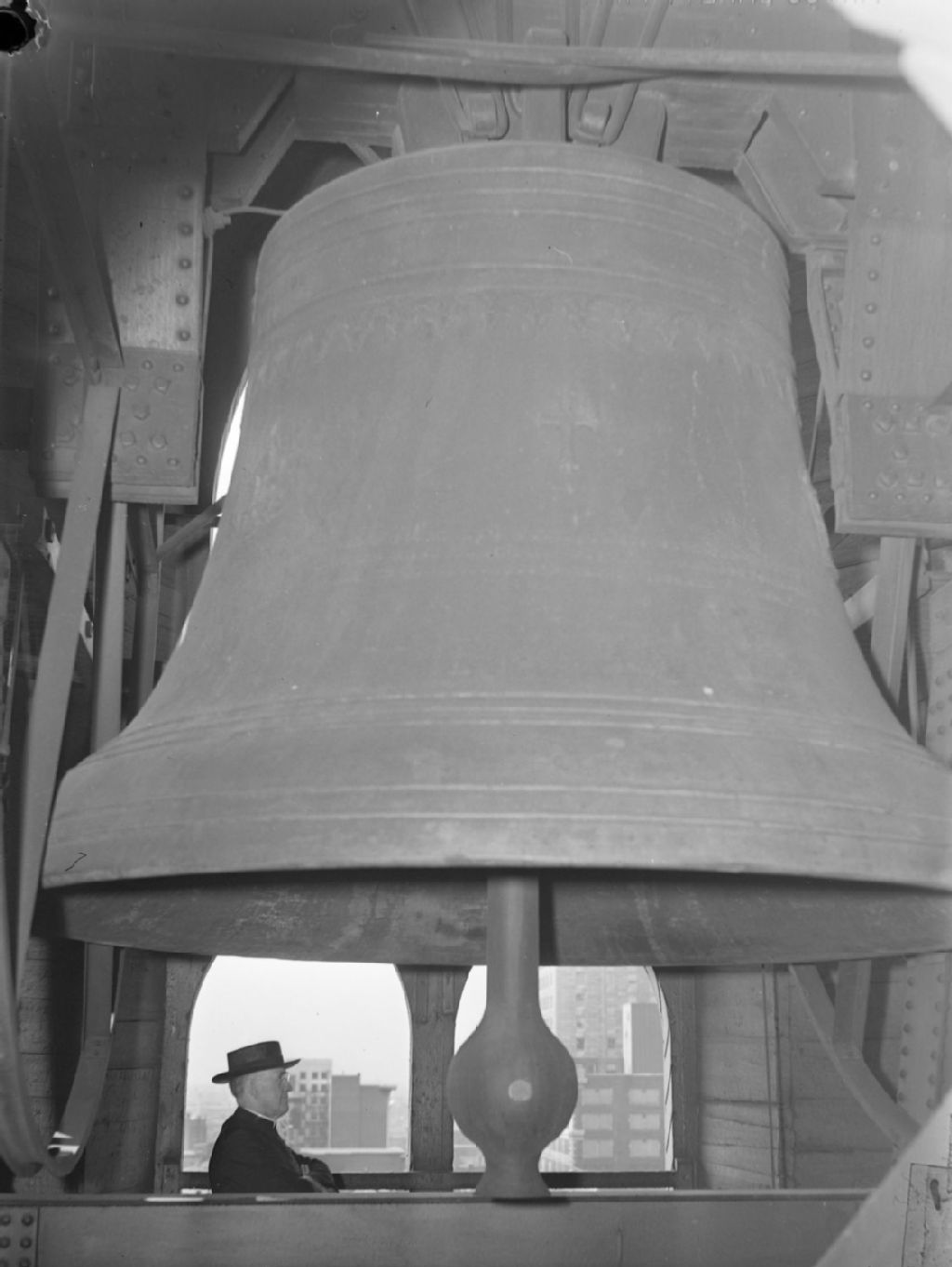 Nous voyons le Gros Bourdon, baptisé Jean-Baptiste, de la basilique Notre-Dame de Montréal. Monseigneur Olivier Maurault p.s.s. se tient de profil près de la cloche
