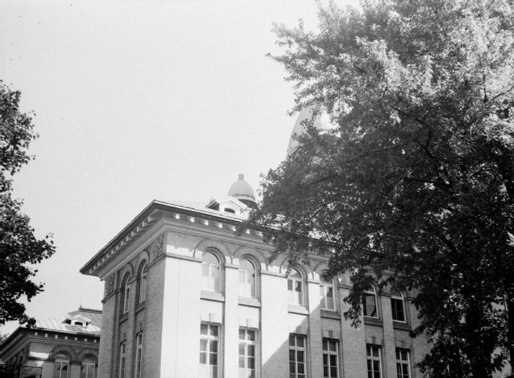 Nous voyons le dôme et une aile de la maison-mère des religieuses de la Congrégation de Notre-Dame située rue Sherbrooke Ouest à Montréal (devenue le Collège Dawson)
