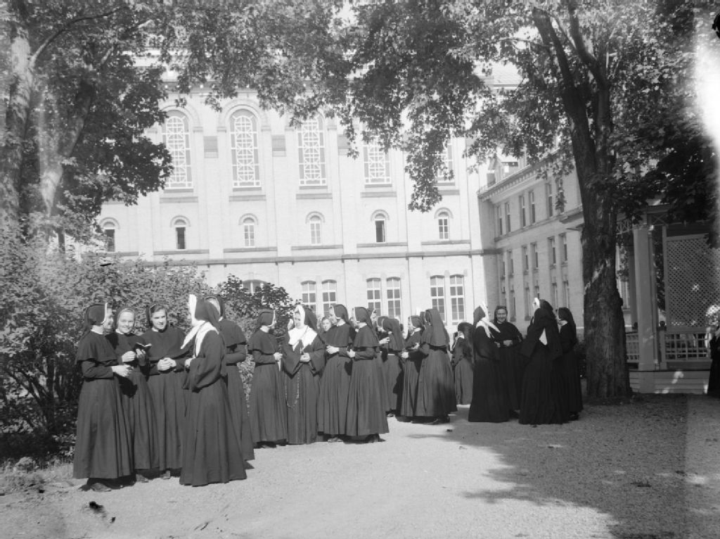 Des religieuses de la Congrégation de Notre-Dame et des novices conversent en groupe dans le jardin de la maison-mère de la congrégation située rue Sherbrooke Ouest à Montréal (devenue le Collège Dawson)