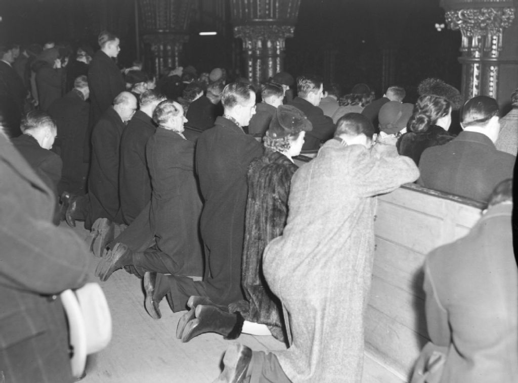 Des fidèles, qui n'ont pas pu trouver de place dans les bancs, sont agenouillés à l'arrière des bancs du jubé dans la basilique Notre-Dame de Montréal