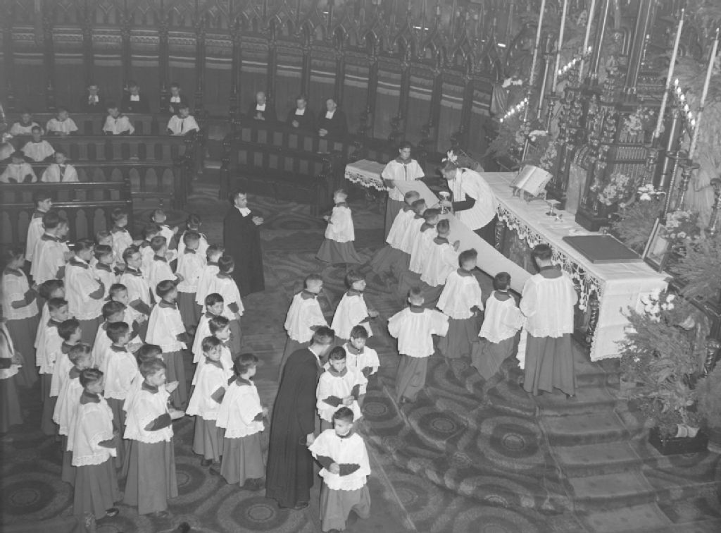 Les enfants de choeur, portant soutane et surplis, communient devant le maître-autel de la basilique Notre-Dame de Montréal