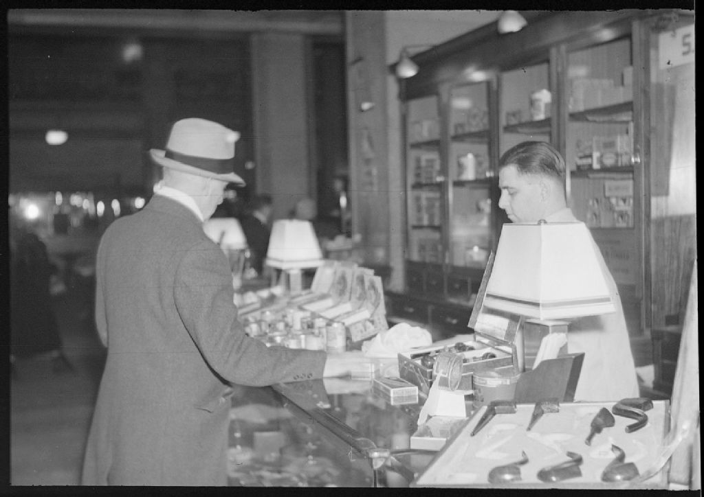 Client au comptoir de la tabagie du "Mt-Royal Hotel", à l'angle de la place Mount-Royal et de la rue Peel à Montréal. Nous apercevons un vendeur près du comptoir où divers objets sont en vente (pipes, cigares et autres articles de fumeurs)