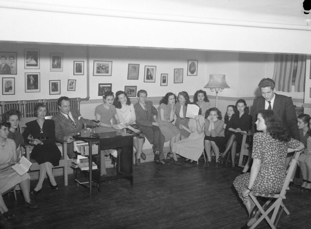 Des actrices et des acteurs suivent des cours d'élocution et de théâtre donnés par madame Yvonne Audet (née Duckett) dans sa résidence de la rue Saint-Hubert à Montréal