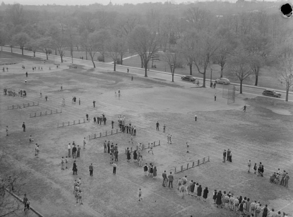 Nous avons une vue d'ensemble de coureurs, de spectateurs et du parcours de la course de haies lors de compétitions d'athlétisme disputées dans la cour de la «Westmount Junior High School»