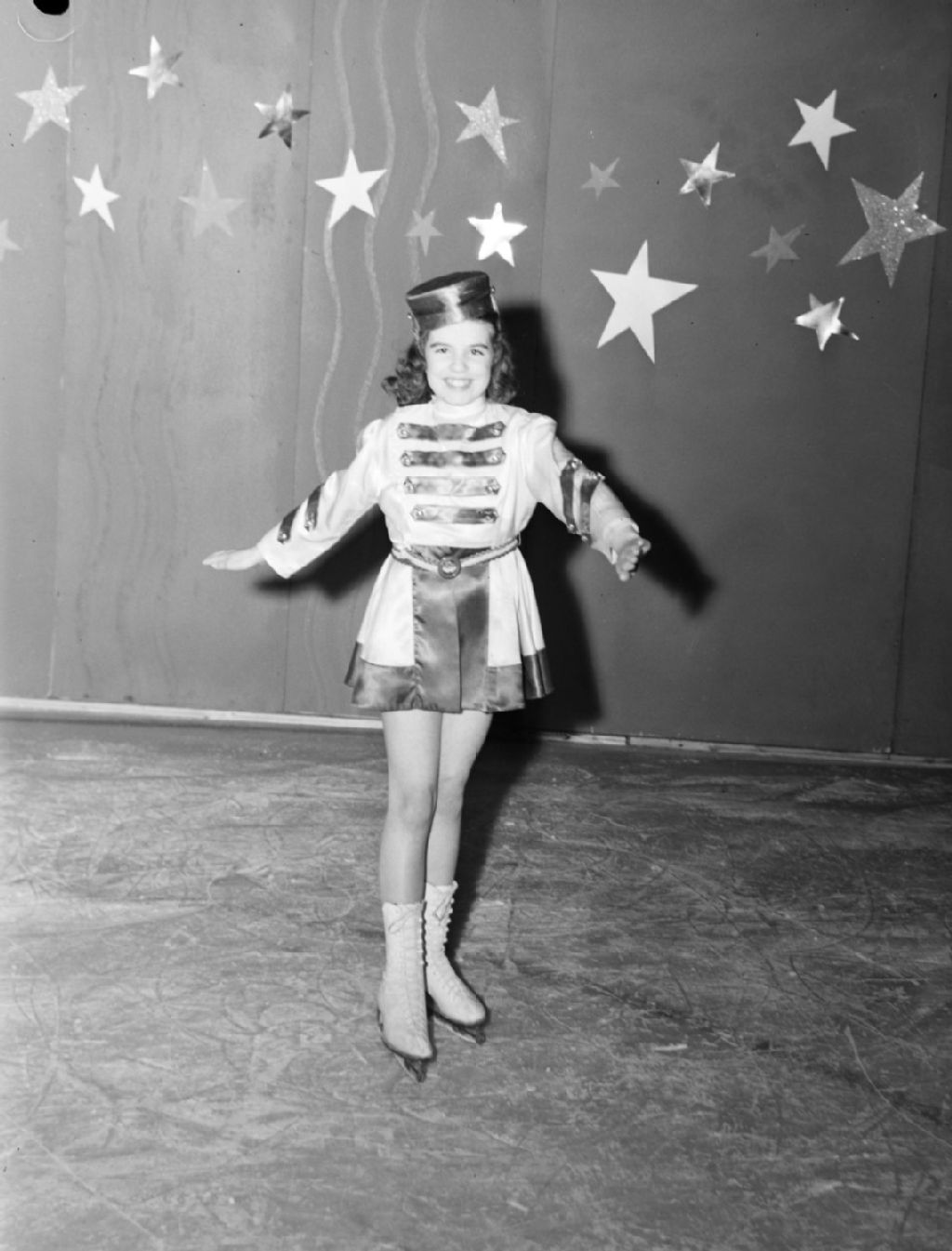 Nous voyons une petite patineuse artistique en costume de chasseur d'hôtel